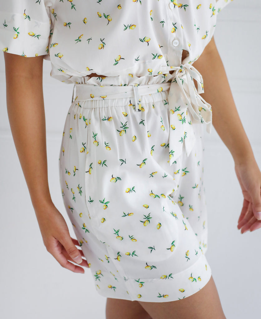 Add a playful twist to your summer wardrobe with these lemonade print paper bag shorts. Featuring a high-waist silhouette with an elastic waistband for comfort and ease, they include a self-tie belt in matching fabric and two side seam pockets.