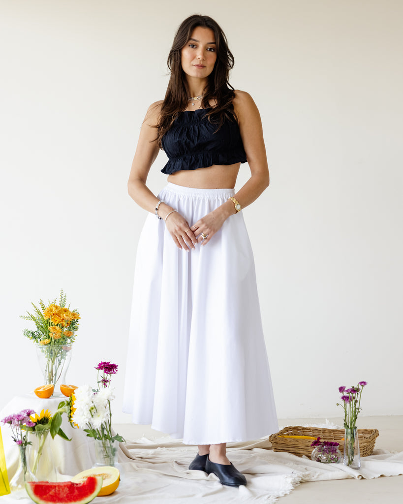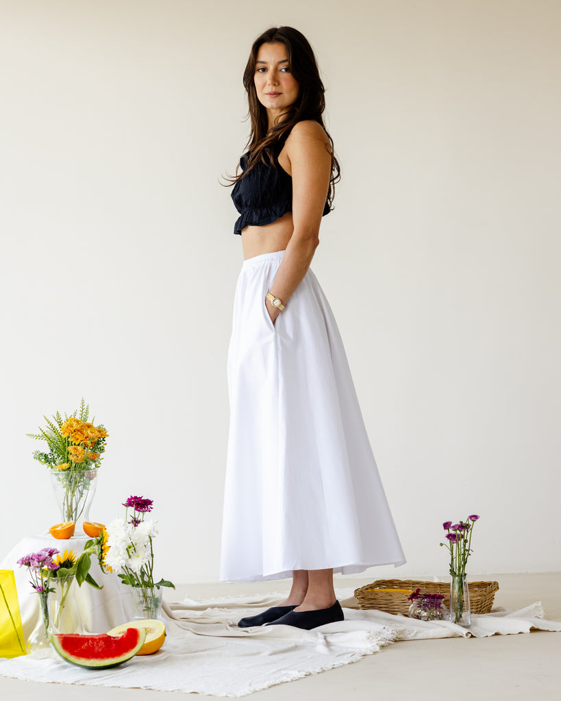 Breezy, light, and effortlessly elegant—this skirt is crafted from crisp cotton poplin for all-day comfort. With an 87 cm length and an elastic waistband, it’s designed in one size to suit all. The relaxed waist and hips provide a flattering fit, while the free-flowing hem ensures ease of movement for every body type. It also features two practical side pockets—because comfort should never mean compromising on function. Perfect for sunny days, seaside walks, or casual outings—it’s your go-to for relaxed summer styling.