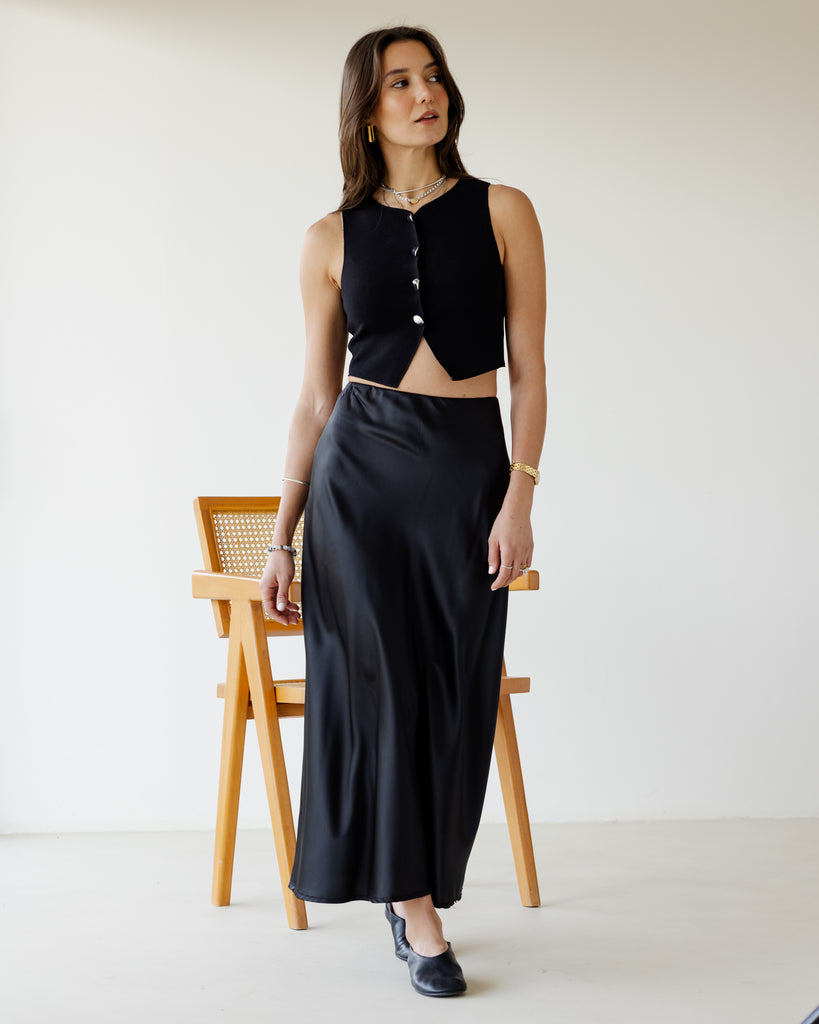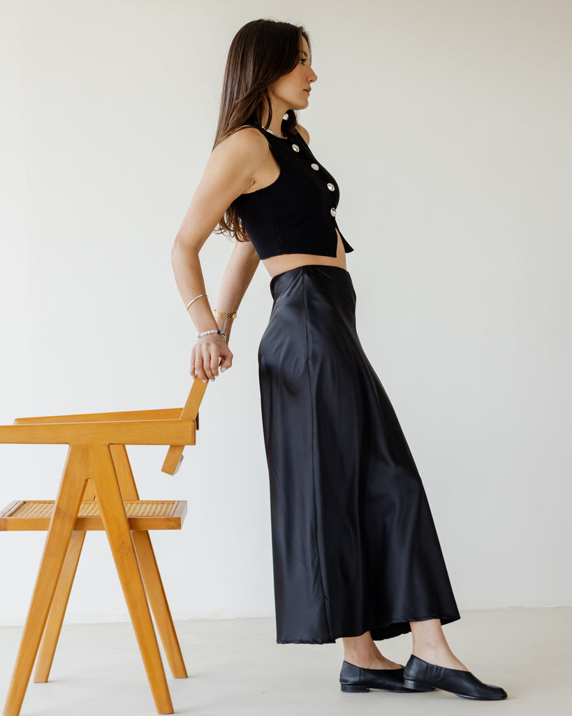 A sleek silhouette meets effortless comfort. This midi-length skirt (90 cm) is crafted from smooth satin with a subtle sheen that moves beautifully with every step. Designed with an elastic waistband for a flexible fit, it’s perfect for dressing up or down—whether paired with a tank for casual chic or elevated with heels for an evening look.