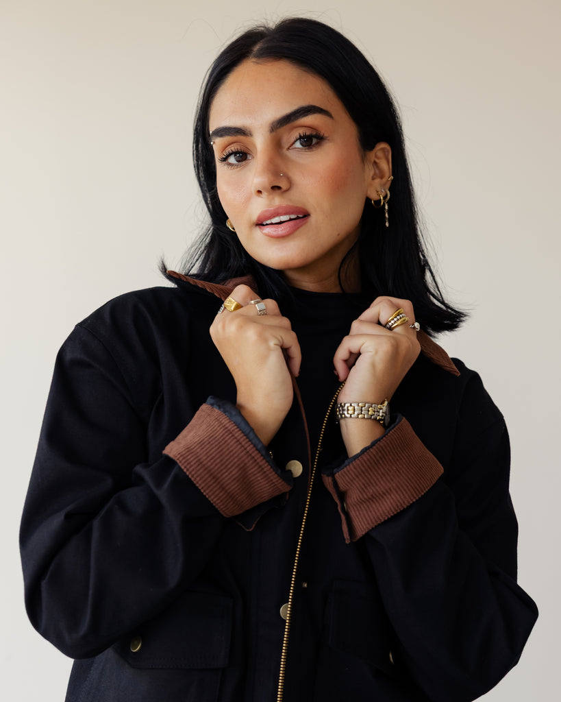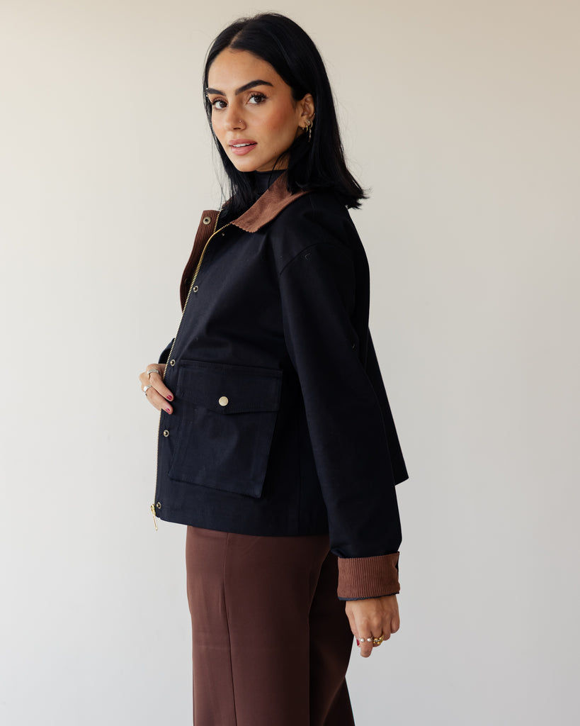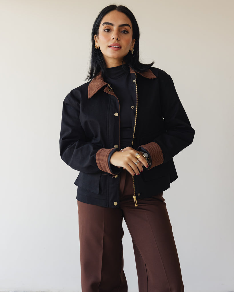 Effortlessly stylish and functional — this Contrast Parka blends modern design with timeless utility. Crafted from premium gabardine, it features corduroy details inside the collar, cuffs, and button stand for a soft, elevated touch. Designed with long sleeves, front patch pockets with flaps, and a hidden zip with snap buttons, it’s fully lined for extra comfort and warmth. Full length: 63 cm.