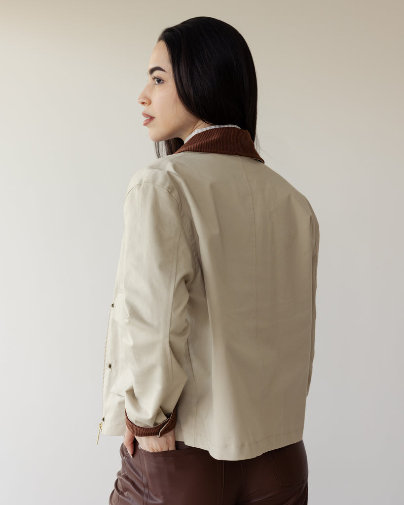 Effortlessly stylish and functional — this Contrast Parka blends modern design with timeless utility. Crafted from premium gabardine, it features corduroy details inside the collar, cuffs, and button stand for a soft, elevated touch. Designed with long sleeves, front patch pockets with flaps, and a hidden zip with snap buttons, it’s fully lined for extra comfort and warmth. Full length: 63 cm.