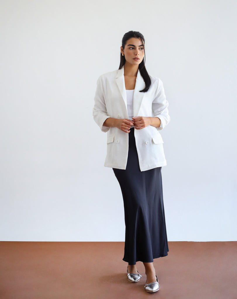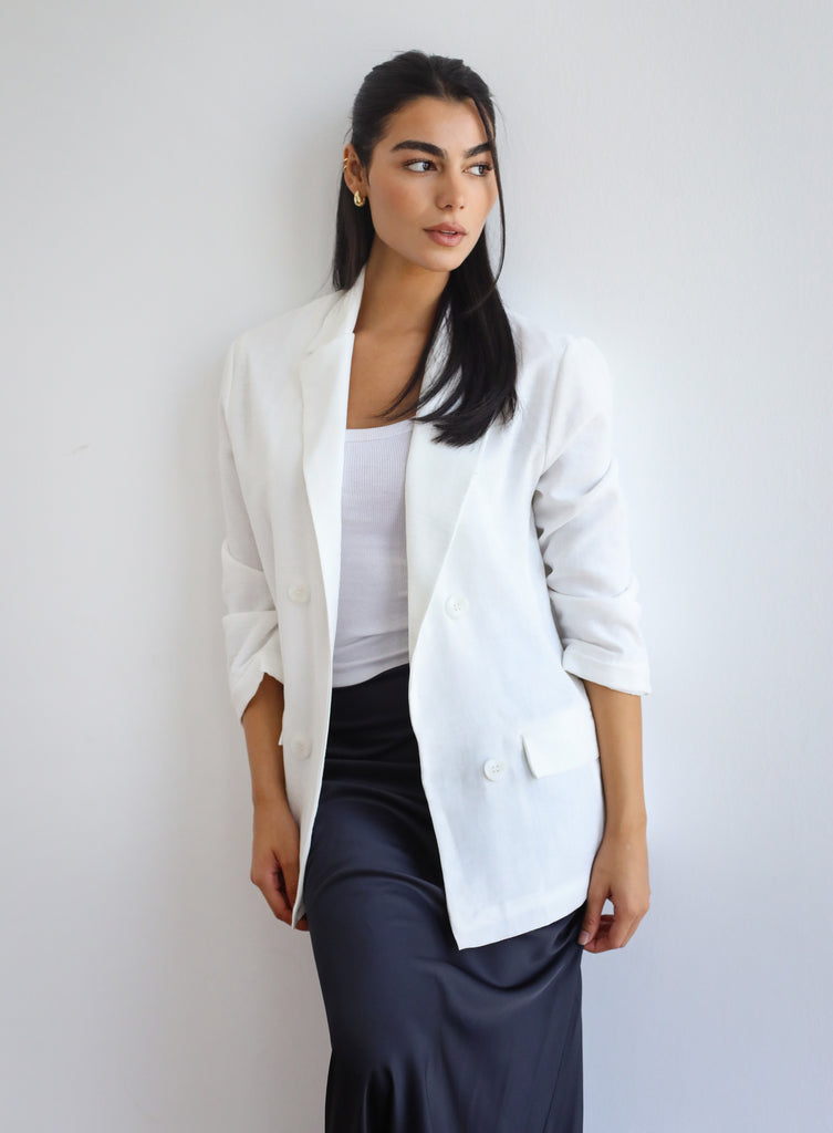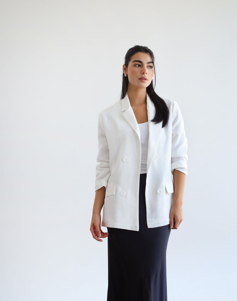 Perfectly tailored, endlessly versatile. This 75 cm linen blazer features a classic lapel collar, front button detailing, and long turn-up sleeves for a relaxed finish. Designed with front false flap pockets, it blends structure with casual ease — a perfect layering piece for both smart and laid-back looks.
