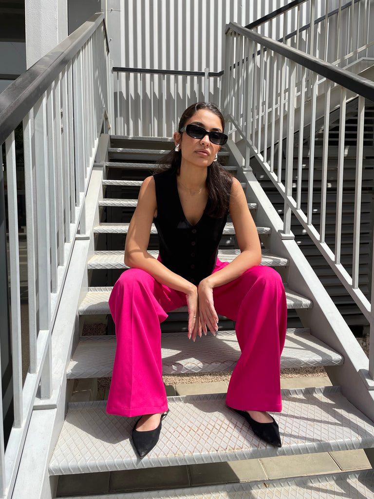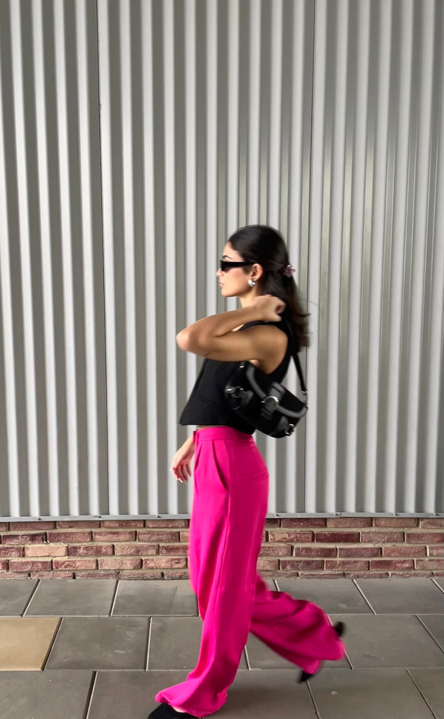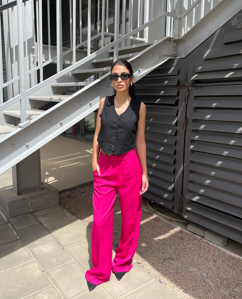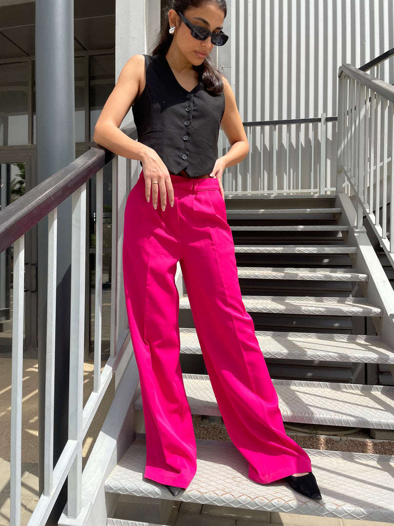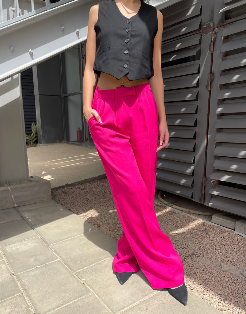 Cotton + Recycled polyester blend fabric. Wide-leg design. High waist. Back dart detail. Two side pockets. False welt back pockets. Zip and inner button and metal hook fastening. Full length is 105cm.
