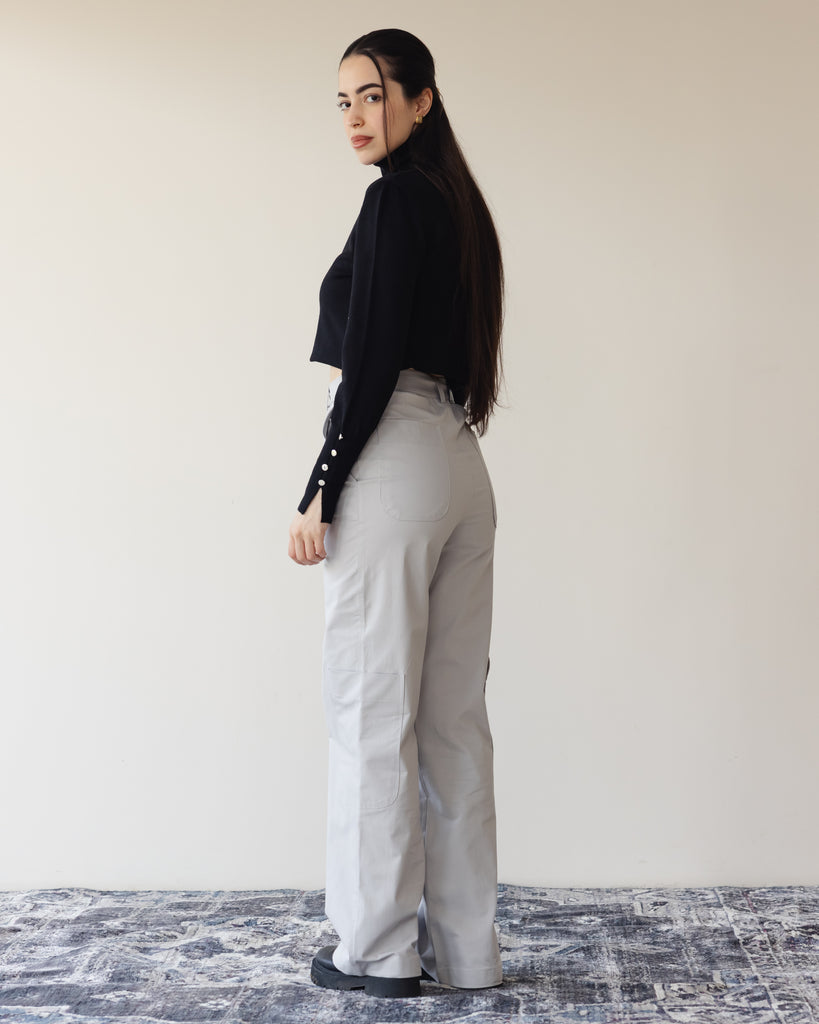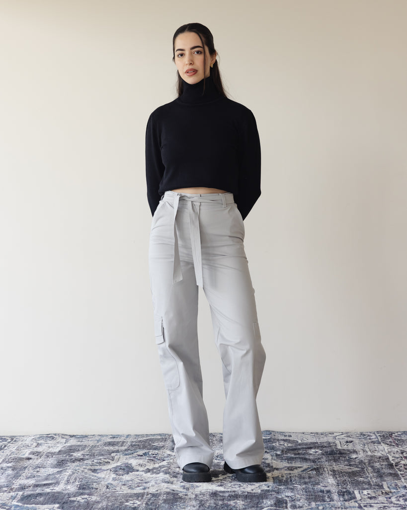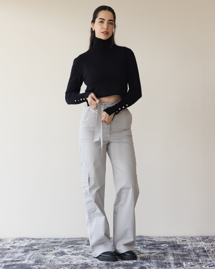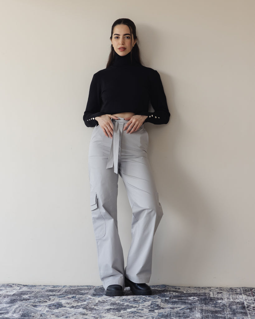 Utility meets elegance in these straight cargo pants, crafted from premium gabardine fabric for a structured yet comfortable fit. Designed with a high waist and a tie belt in matching fabric, they define your silhouette while keeping the look effortlessly cool.