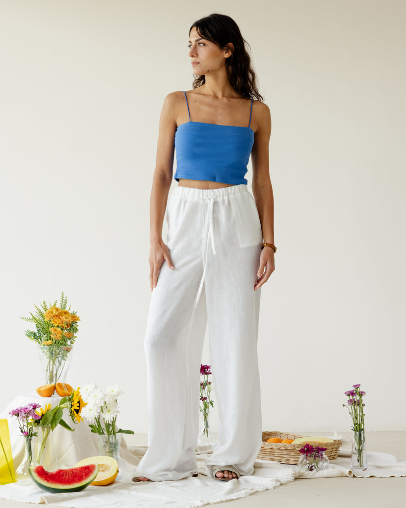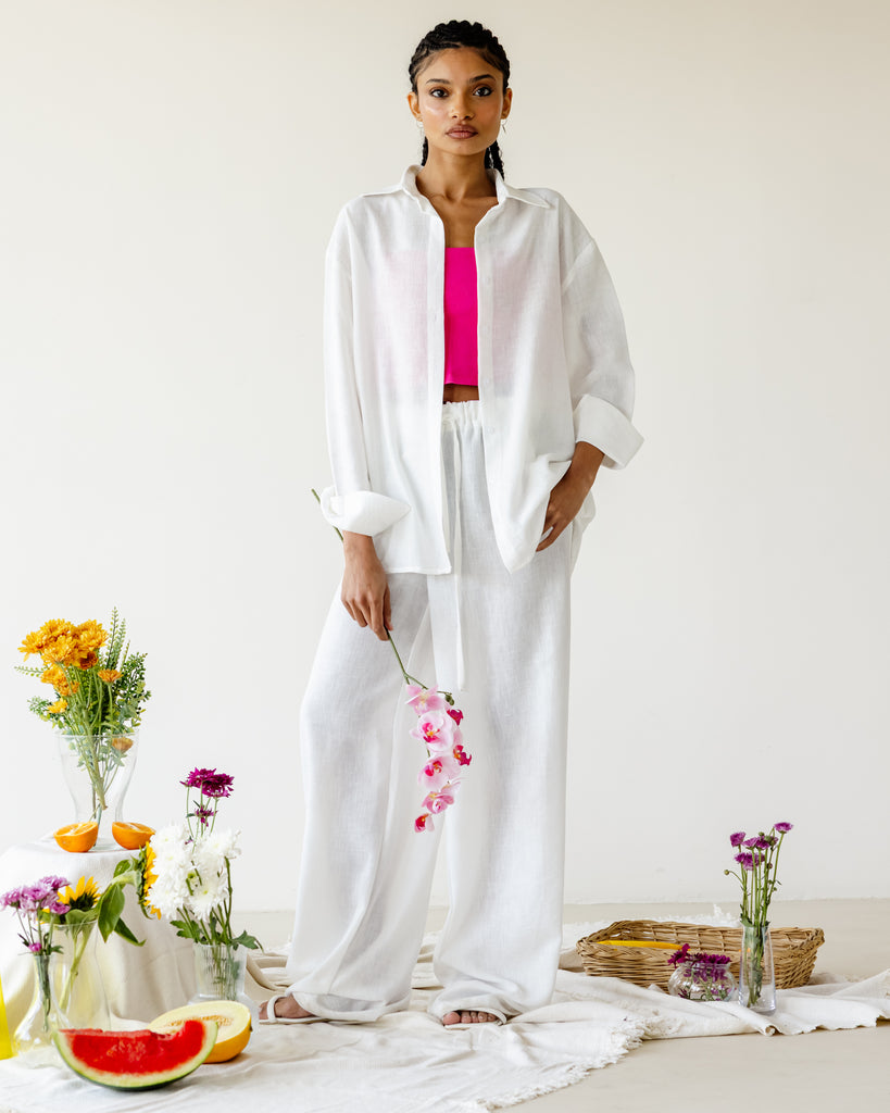 Breezy and beautifully tailored, this full-length pant is crafted from premium pure linen for a breathable, relaxed feel. Designed with a high-rise elastic waist for all-day comfort, it features a flattering wide-leg silhouette and two side pockets for ease. With a length of 112 cm, it offers effortless elegance whether worn solo or styled as a set with the matching shirt. A summer staple you’ll reach for again and again.